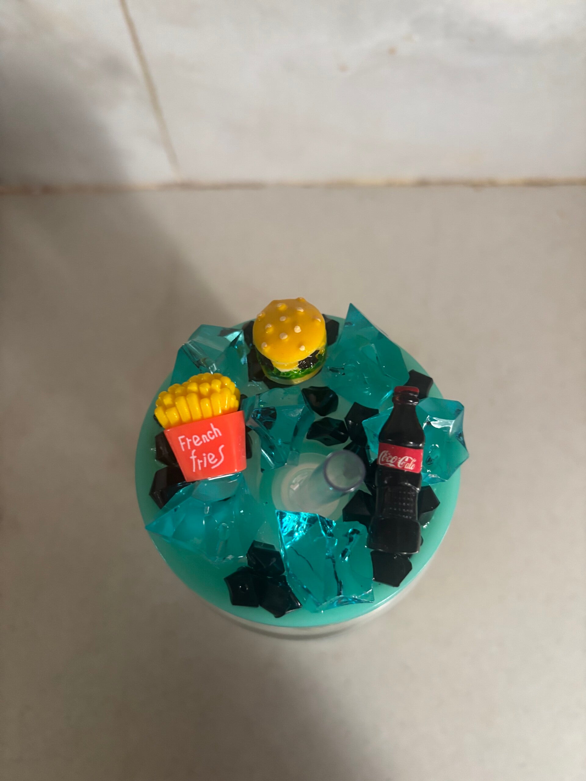 Το διάφανο σώμα αναδεικνύει το πολύχρωμο σχέδιο, ενώ το καπάκι ξεχωρίζει με 3D διακόσμηση εμπνευσμένη από fast food (burger, πατάτες, αναψυκτικό) και εντυπωσιακά διακοσμητικά στοιχεία σε αποχρώσεις τιρκουάζ. Διαθέτει ενσωματωμένο καλαμάκι για άνετη και ασφαλή χρήση από παιδιά.