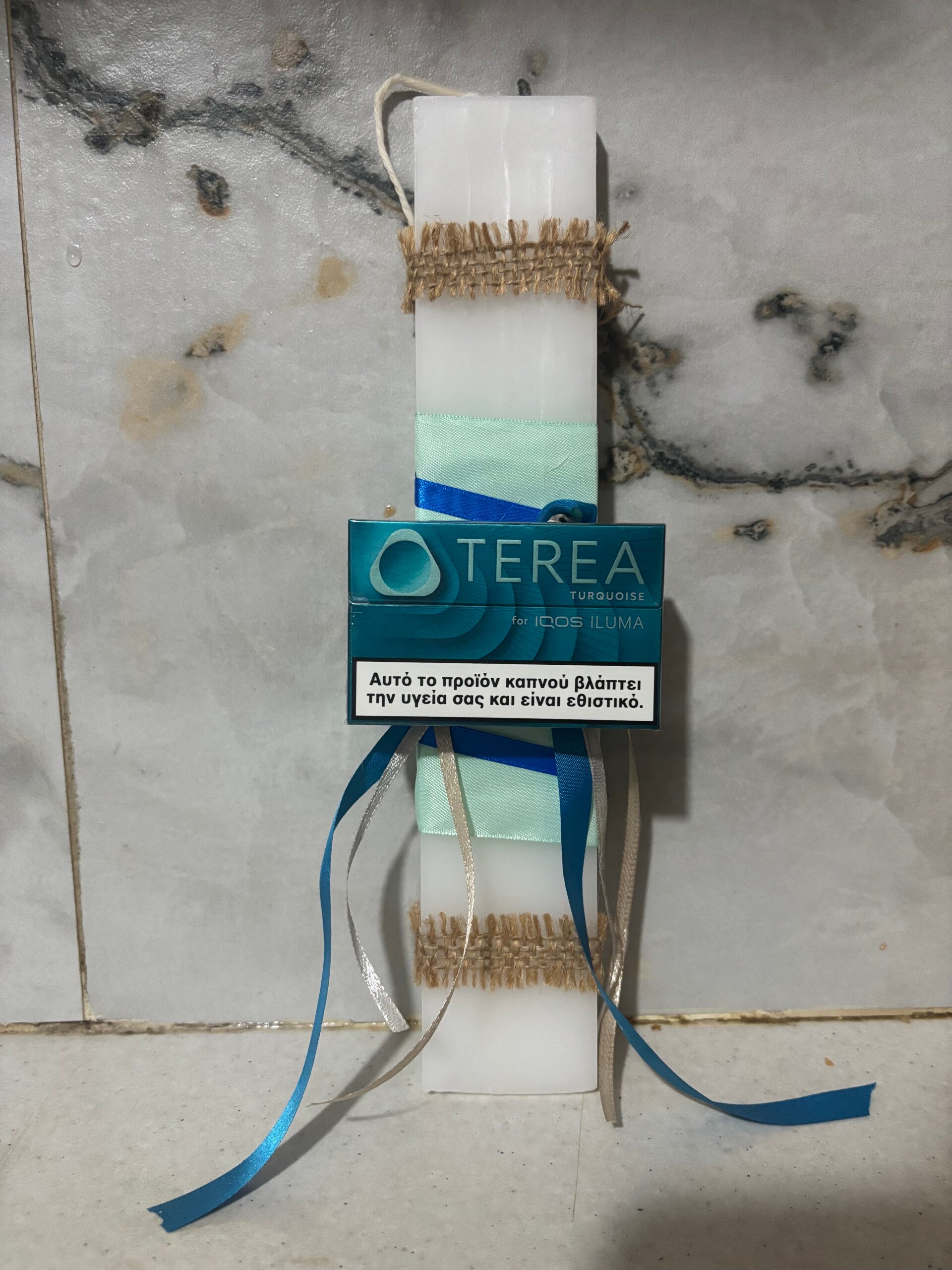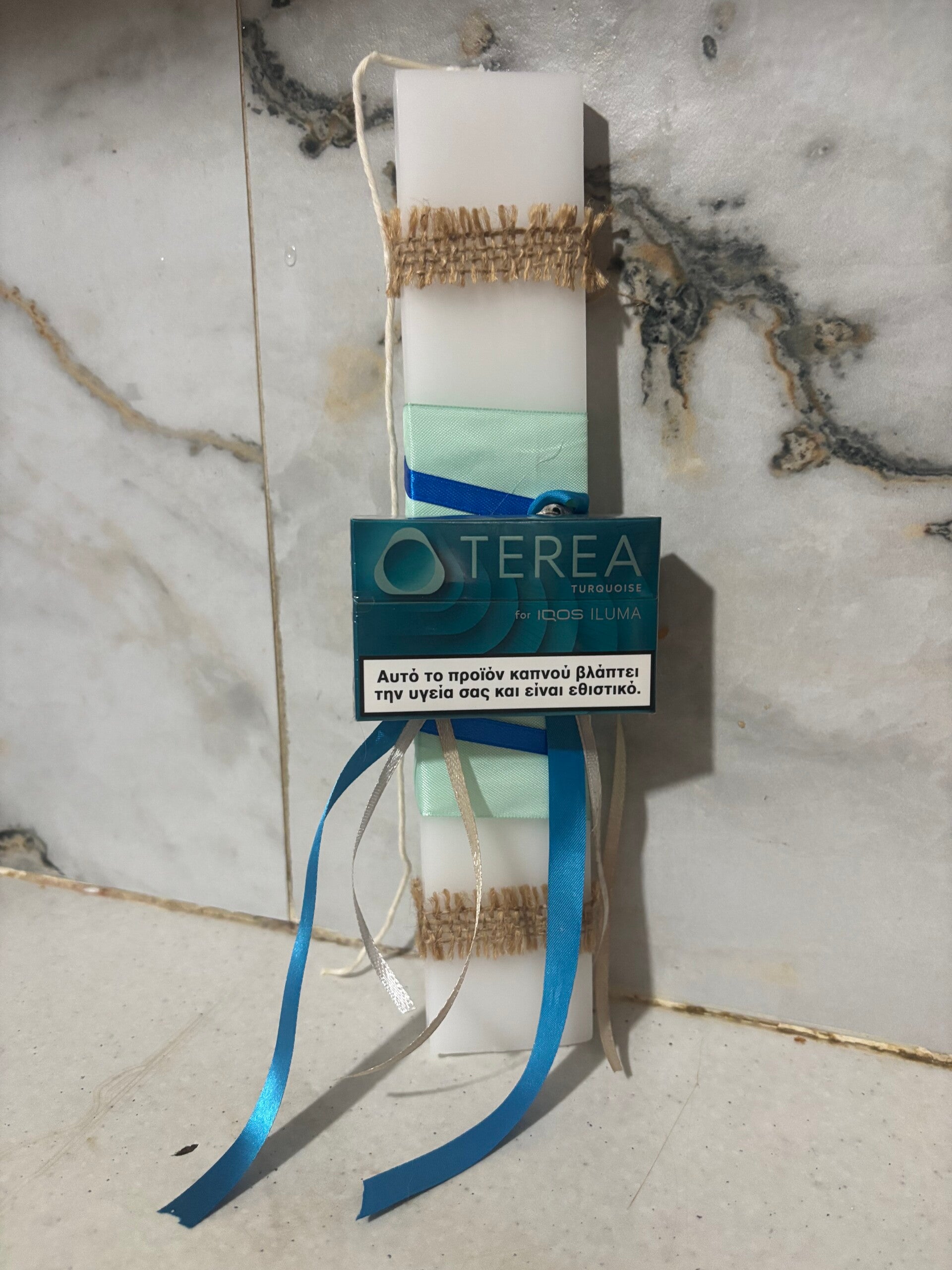 Χειροποίητη λαμπάδα σε λευκή απόχρωση, διακοσμημένη με φυσικό λινάτσα και σατέν κορδέλες σε τιρκουάζ και μπλε αποχρώσεις. Συνοδεύεται από συσκευασία TEREA Turquoise για IQOS ILUMA, δημιουργώντας ένα ιδιαίτερο και μοντέρνο πασχαλινό δώρο.