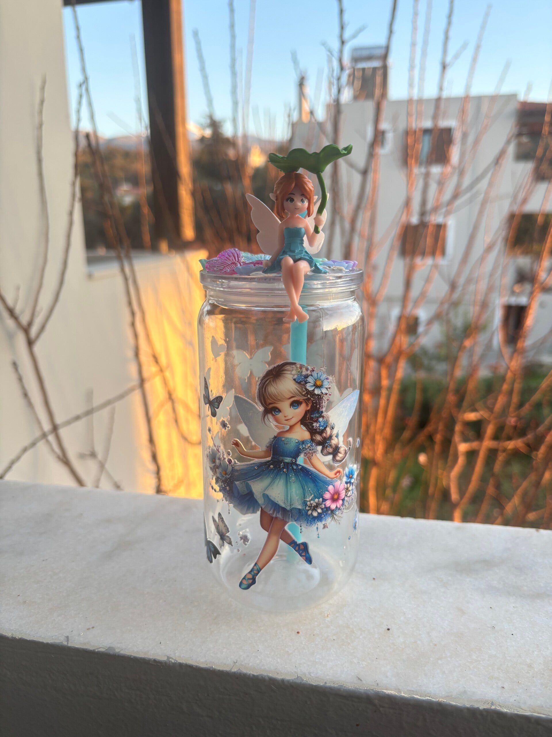 Το καπάκι του ποτηριού ολοκληρώνεται με μια τρισδιάστατη φιγούρα νεράιδας που κρατά φύλλο, δίνοντας μια ξεχωριστή και χαριτωμένη πινελιά. Συνοδεύεται από καλαμάκι, κάνοντάς το ιδανικό για καθημερινή χρήση αλλά και για ιδιαίτερες στιγμές.